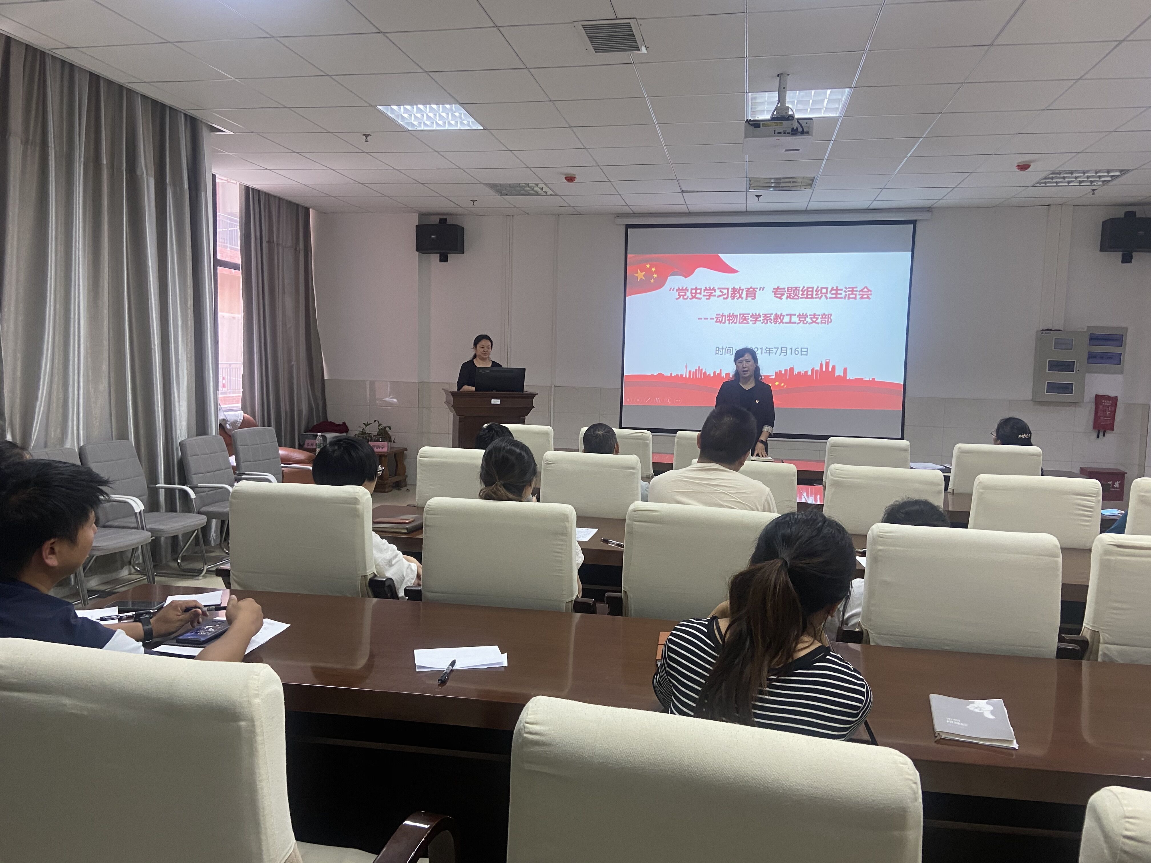 按照贵大党史教育办的有关要求,2021年7月16日上午,动物科学学院动物医学系教工党支部在贵州大学西校区崇学楼234室召开党史学习教育专题组织生活会。会议由动医系教工党支部书记鲜思美主持,学院党委书记罗聃宁列席会议并进行了指导。