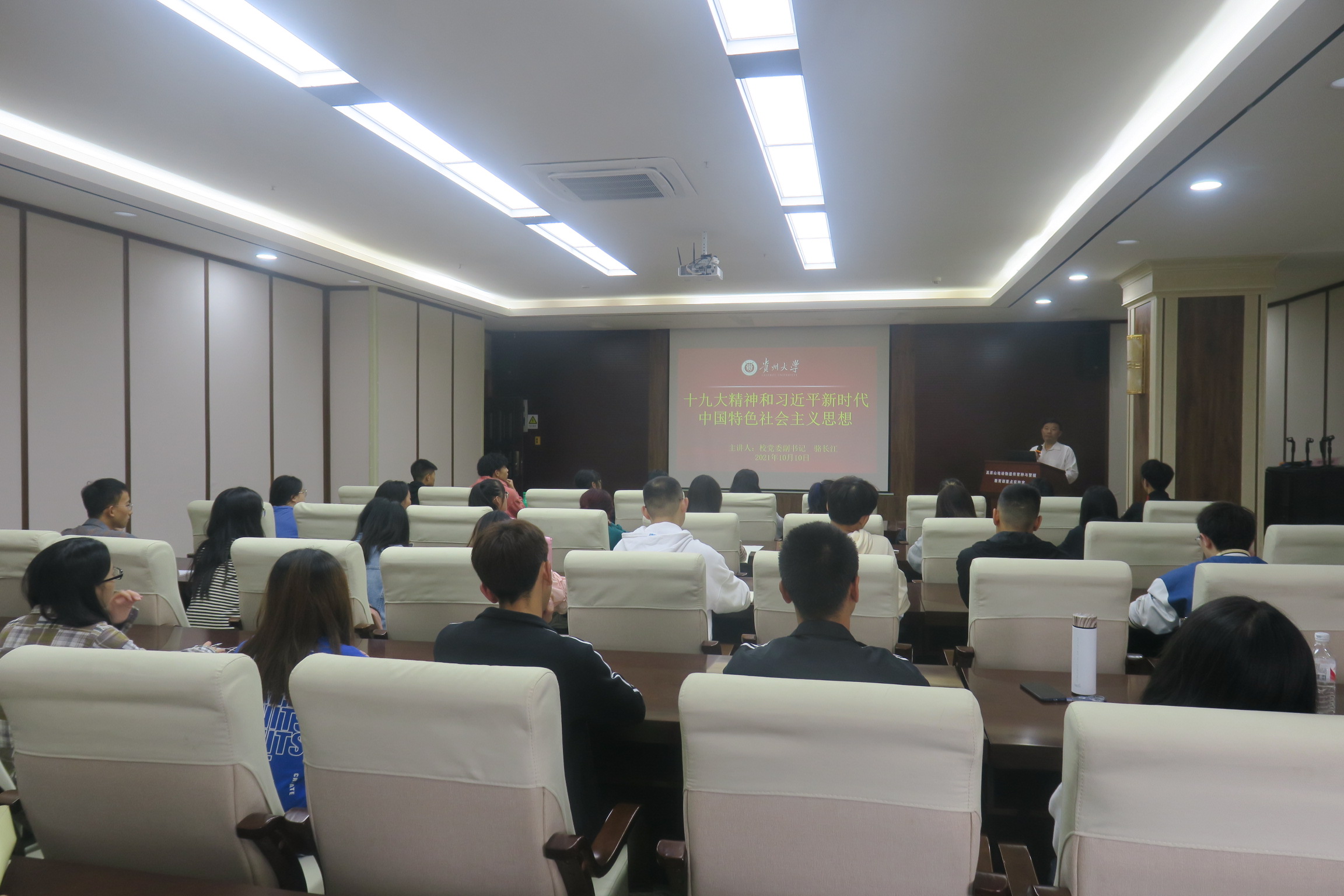 2021年10月10日下午2:30,校党委副书记骆长江在崇学楼324为动物科学学院第三十五期入党积极分子培训班学员授课。授课内容为《党的十九大精神和习近平新时代中国特色社会主义思想》,党课由动物科学学院党委书记罗聃宁主持,入党积极分子50余人参加培训。