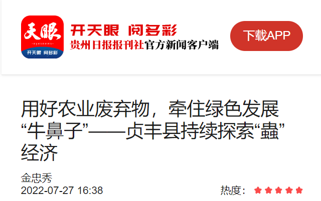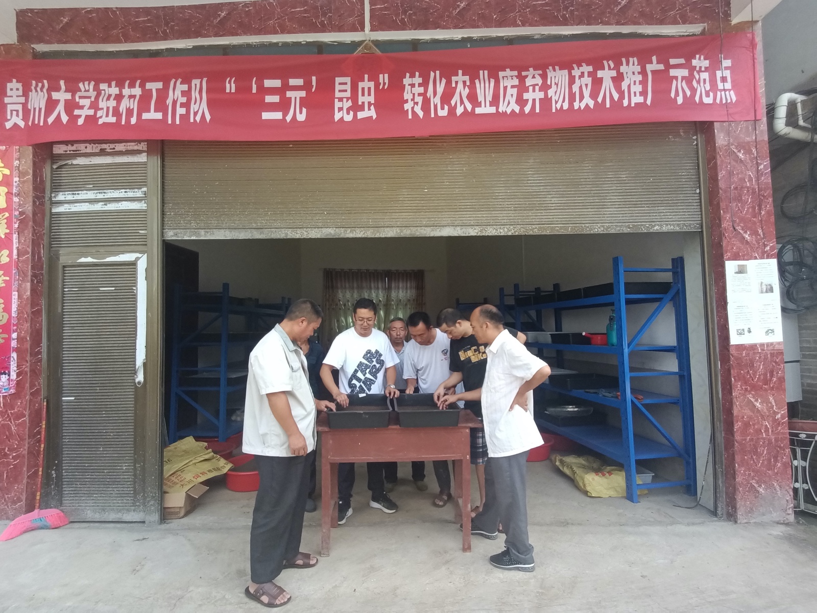 “‘蟲’产业,是我们村围绕‘三元’昆虫养殖开展的特色产业项目。贵州大学驻村工作队以营盘村为试点,建立‘三元’昆虫转化农业废弃物产业推广示范点,即以蛴螬和黄粉虫转化畜禽粪便和秸秆为虫体蛋白,随后将虫体蛋白做成饲料,用于土元养殖,土元由公司收购,促进增收和人居环境改善,让我们村富起来。”7月21日,贞丰县平街乡营盘村驻村第一书记郑寅向到访村民介绍村里“蟲”经济发展情况。