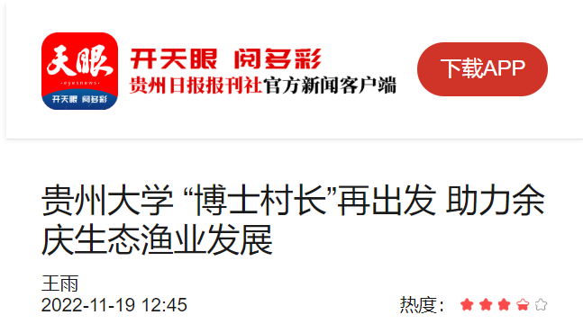 为贯彻落实党的二十大精神,巩固拓展脱贫攻坚成果同乡村振兴有效衔接,推动贵州生态渔业高质量发展,近日,贵州大学“博士村长”生态渔业队来到余庆县新寨村生态环保型渔业科普示范基地,开展调研和技术推广。