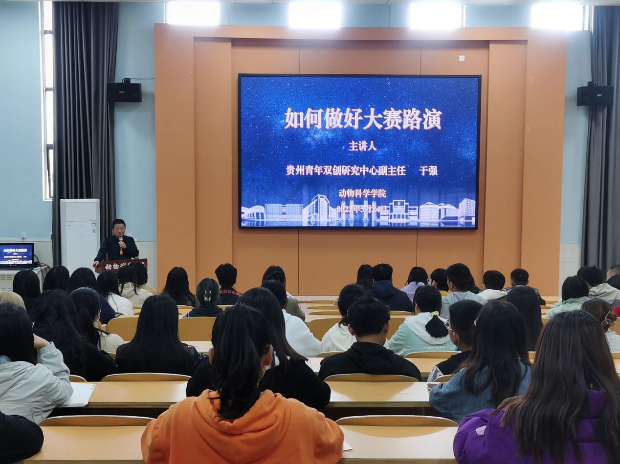 为了深度打磨学院第十八届挑战杯参赛项目,提升参赛作品水平,增强学生创新创业意识。3月24日中午,动物科学学院特邀教育部创新创业导师、贵州省青年双创研究中心副主任于强老师莅临学院开讲,讲座围绕“如何做好大赛路演”这个主题展开。学院部分挑战杯参赛项目指导老师和200余名参赛学生参加,讲座由学院党委副书记杨乐主持。