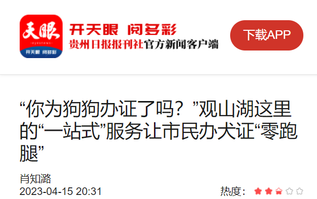 “您的狗之前已经完成了疫苗注射,现在只需要在犬卫士(贵养犬)APP上申请即可办理犬证。”现场,贵阳市公安局观山湖分局长岭派出所民警、贵州大学动物科学学院大学生志愿者们向居民发放文明养犬宣传资料,引导犬主线上申办养犬登记。漂亮倩宠物店宠物医生为居民宠物提供免费注射疫苗服务,为居民提供科学养犬咨询服务。疫苗注射、犬证申请、犬证审核全部可以在现场完成,只需几分钟,居民便能为爱犬成功办理“身份证”。