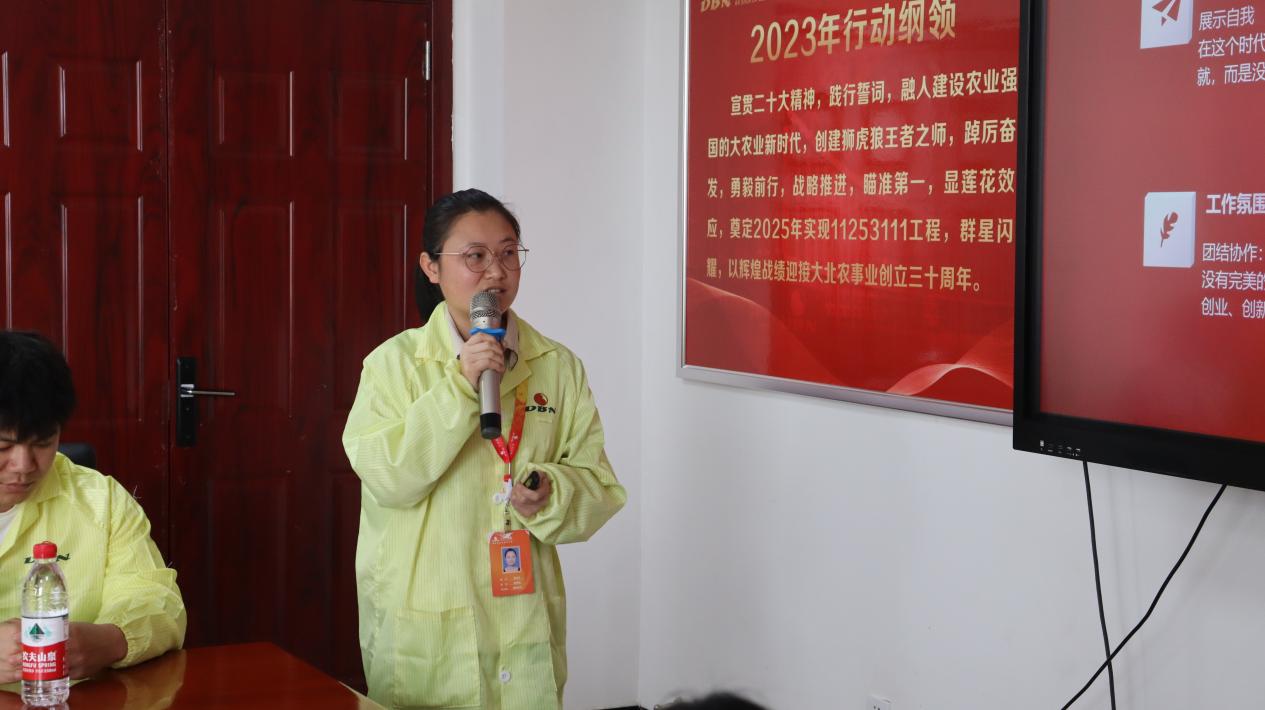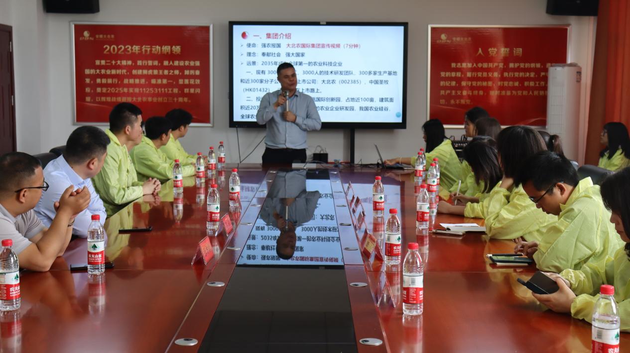 介绍了学院概况、学科分布和毕业生基本情况。她表示,希望通过本次访企拓岗达到三个愿景:一是跟踪已毕业学生相关情况,听取大北农对往年录用的学院毕业生的评价和反馈。二是了解企业对人才的需求,及时调整学院教育教学的重心,实现我院畜牧兽医人才的高质量发展。三是为毕业生拓展更多的就业岗位,为大北农输送更多的优秀人才。