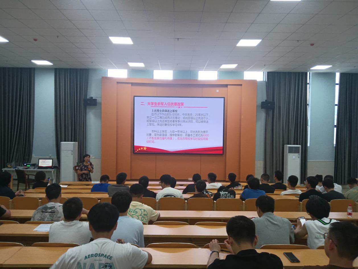 罗聃宁结合学院征兵工作实际解读了参军入伍各项政策,分析了学院近几年入伍学生的兵源去向,介绍了入伍学生的入伍经历和成长过程,用一个个鲜活的事例给学生诠释了大学生入伍的各项优抚优待政策,勉励学生理性思考,坚定信念,在人生的十字路口做出影响自己一生的抉择,积极参军尽义务,不悔戍边卫国防。
