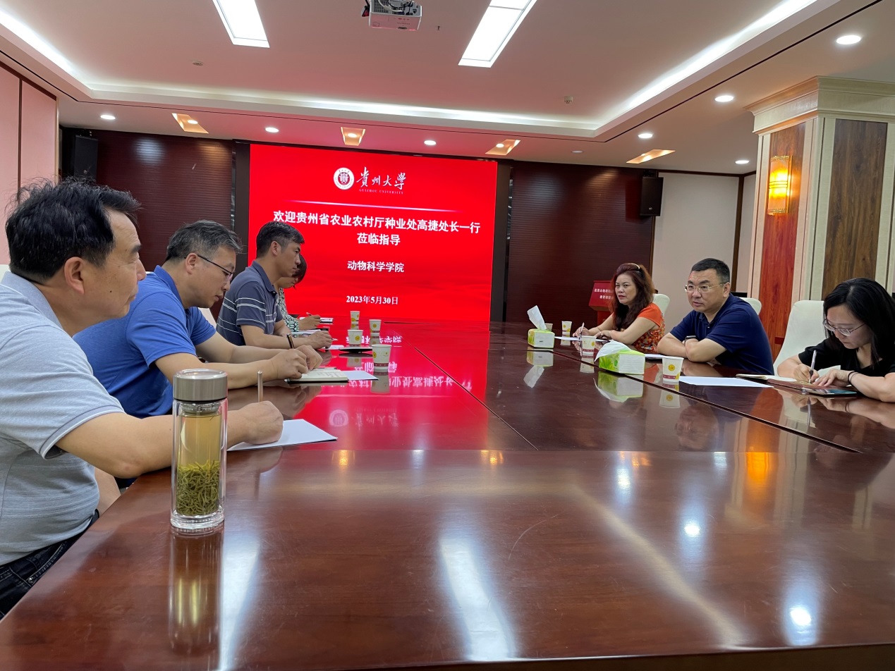 5月30日,贵州省农业农村厅种业管理处处长高捷、副处长王筱丽等一行3人莅临我院调研贵州地方畜禽种质资源库建设情况并召开座谈会。学院副院长陈祥教授、杨胜林教授、李辉教授、张福平副教授等老师参加了座谈会。