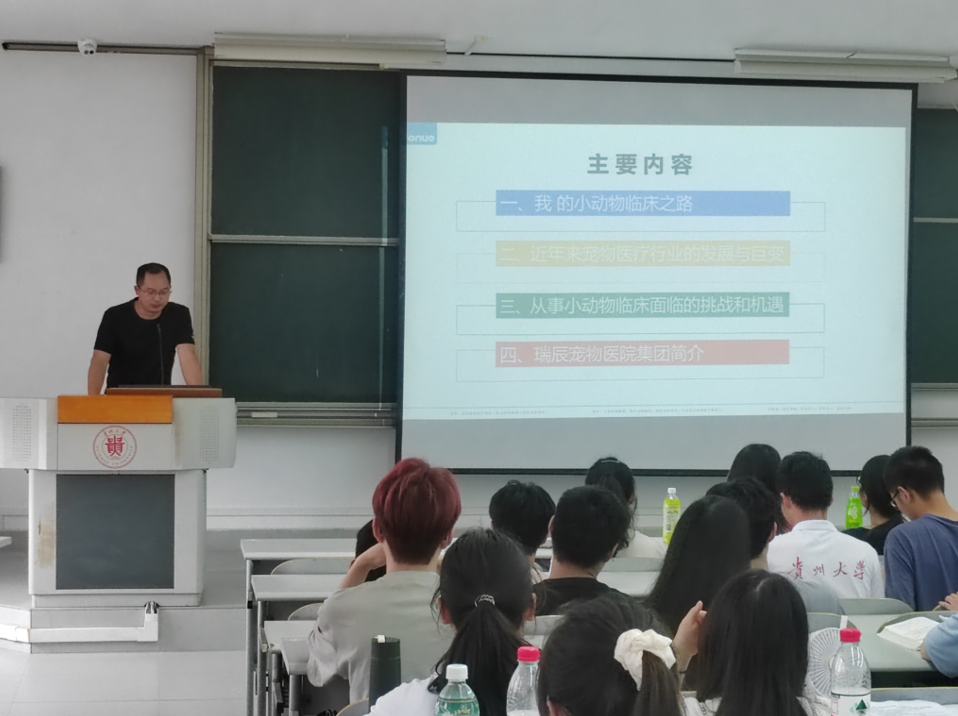 专业认知课程邀请了贵州省农业农村厅总兽医师唐隆强、瑞辰贵州分公司总经理江中友为同学们授课。授课内容包括动物医学基础兽医、预防兽医、临床兽医学科方向介绍,动物医学行业过去、当前、未来的现状和发展趋势。