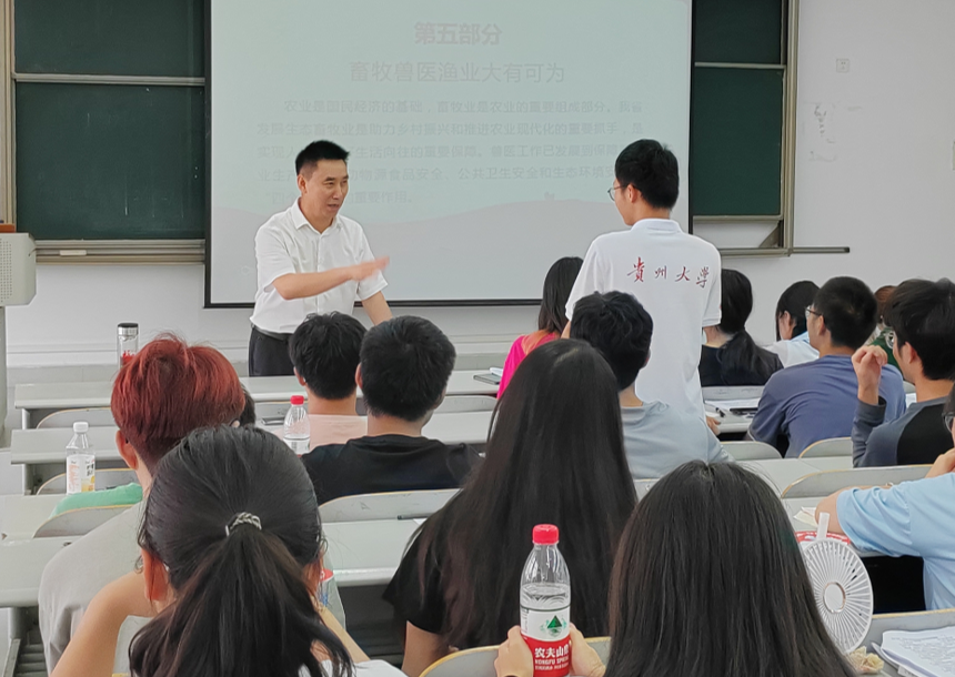 唐隆强在授课中以亲身经历向同学们讲解畜牧兽医专业前景之大,发展面之广。