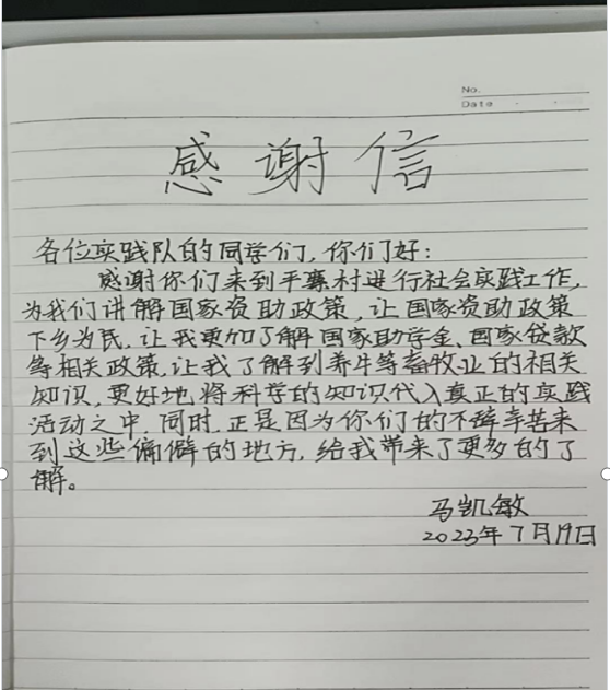 一分耕耘、一分收获,同学们的努力付出获得了当地百姓的认可。冬妹村的老党员杨忠兴亲自手写了一封感谢信,赞扬了实践队员的无私奉献行为,表达了他对党的感恩。当地平寨村的村民马凯敏也书写了一封感谢信,感谢实践队员给他们宣传国家资助政策,感谢实践队员给他们带去科学养殖技术。当地百姓的认可是对实践队员最好的回报,在乡亲们的夸赞面前,苦点累点又算得了什么呢?