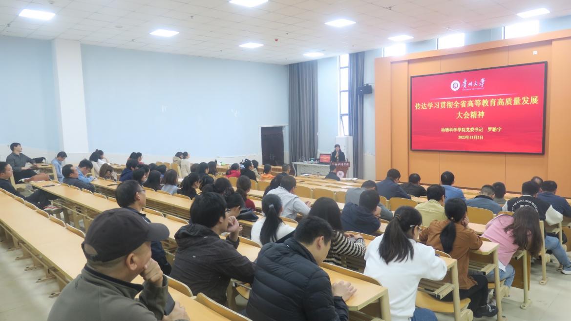 11月2日,动物科学学院召开全院教职工大会,传达学习全省高等教育高质量发展大会精神及学校高质量考核等相关工作要求,全院教职工100余人参加学习,会议由院党委书记罗聃宁主持。