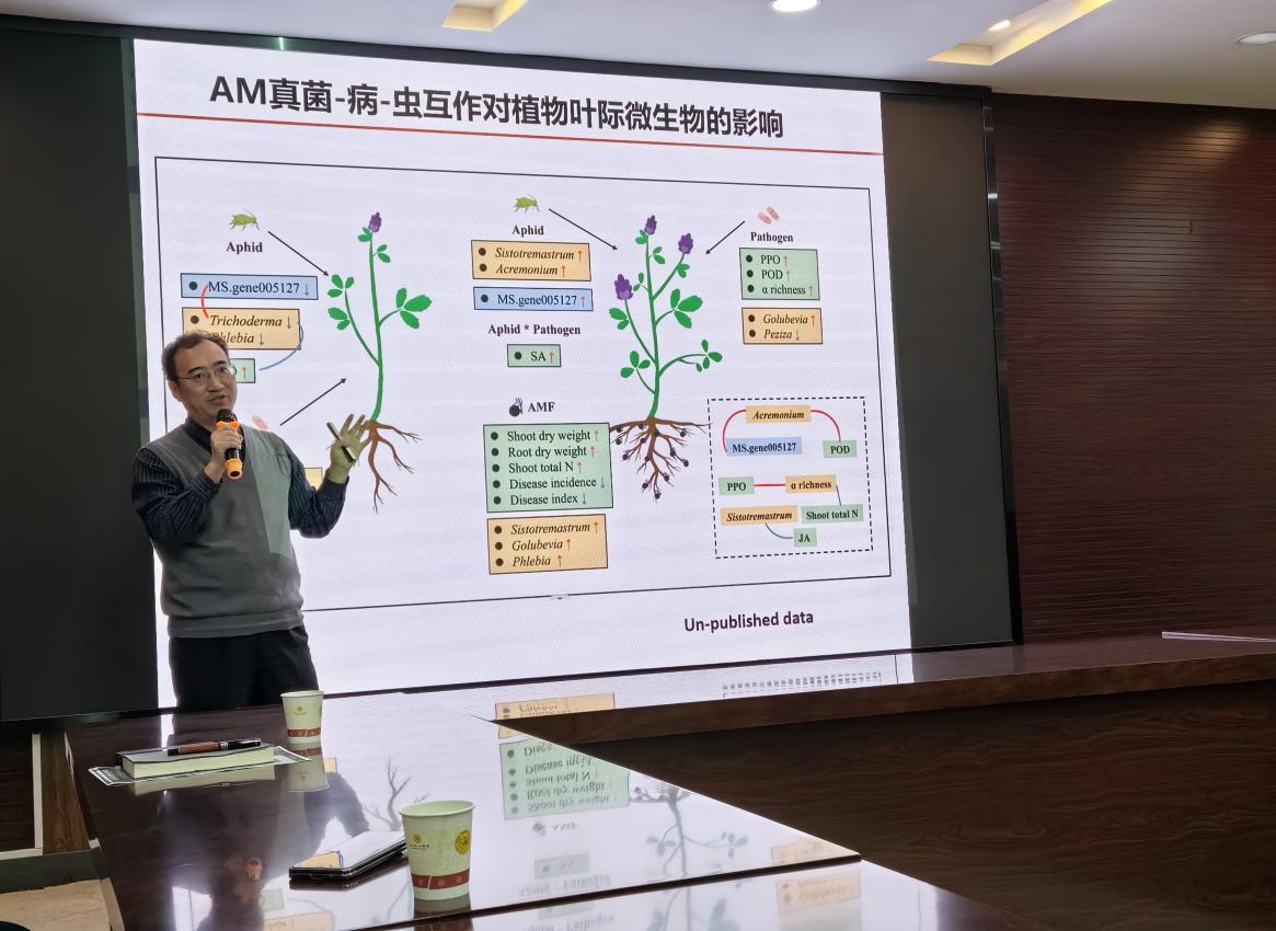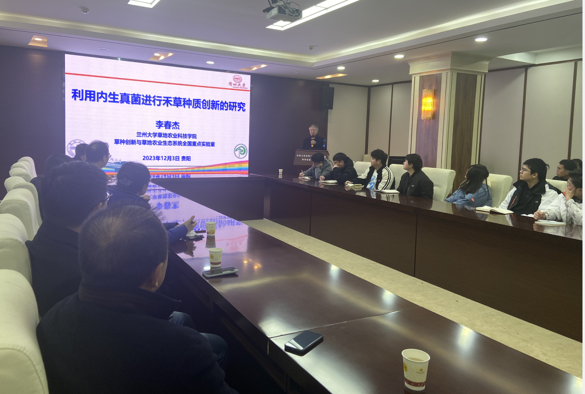 会上,李春杰、段廷玉两位老师分别为我院师生做了题为《利用内生真菌进行禾草种质创新的研究》《AM真菌影响牧草抗病虫的潜在机制》的学术报告。