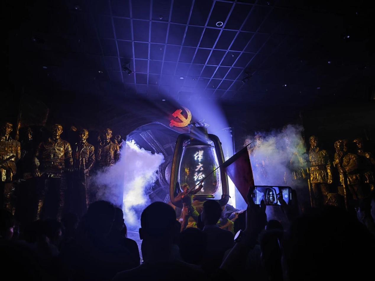 踏入昏暗的序厅,一盏马灯映入眼帘。在微光的照耀下,众人徜徉其间,与幕布两侧展示的伤痕累累的红军战士“擦身而过”,在红军战士们一声声的自白中,大家仿佛穿越回那个为民族解放英勇牺牲的岁月,与红军战士们共赴长征之路,直面那个烽火连天、硝烟弥漫的时代。
