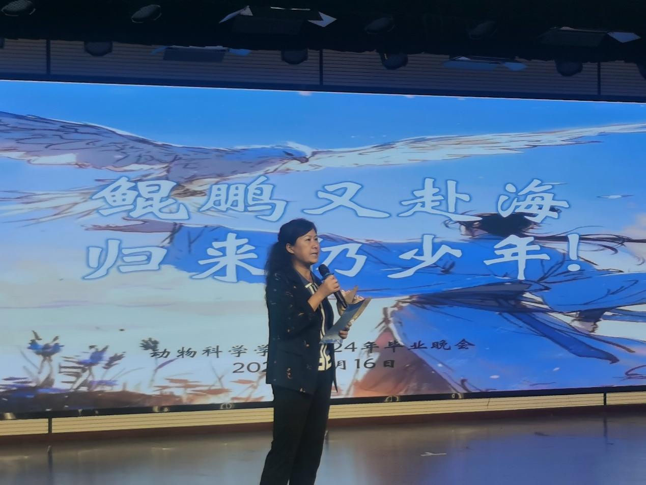 最后,动科2203班的表演《我们的明天》为毕业的学姐学长送上满满的祝福,同时也为我们送上了对未来的美好祝愿。随着歌声的结束,动物科学学院党委书记罗聃宁也为即将毕业的本科生、研究生送上了最温暖的祝福,她祝愿同学们在未来无论是求学还是工作的道路上,都是一片坦途,同时也嘱咐亲爱的孩子们离开母校这个大家庭后,要照顾好自己,母校永远欢迎同学们回家看看。