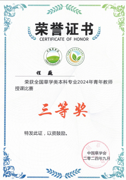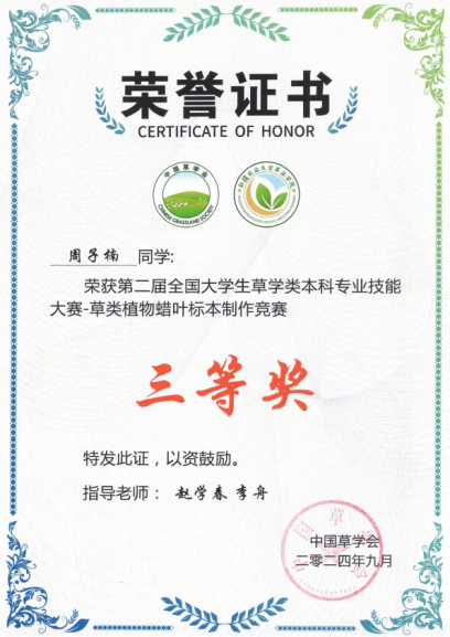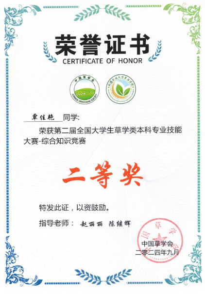 我院草业科学专业2022级覃佳艳、周子楠、何毅浪和2023级周佳艺、周益正航组成学生参赛队,在指导教师郝俊、赵丽丽、赵学春、董瑞、陈继辉等老师的带领下,与全国来自开设草业科学专业院校300名师生同场竞技,他们果敢认真、团结协作,展现了过硬的理论知识和技能水平,共荣获单项比赛二等奖1项,三等奖4项的佳绩。程巍副教授在全国草学类本科专业2024年青年教师授课比赛中荣获三等奖。