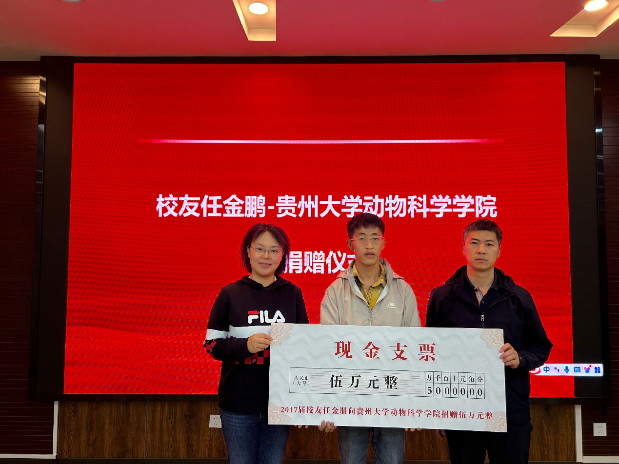 在捐赠仪式上,陈祥对任金朋的捐赠表示感谢,感谢任金朋为学院发展和人才培养等方面给予的大力支持。任金朋对贵州大学的培养表达了感恩之情,希望为动物科学学院人才培养贡献一份力量。