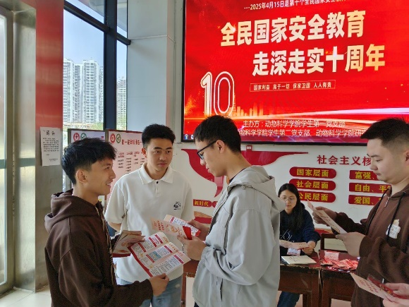 为深入学习贯彻总体国家安全观,增强党员同志国家安全意识,学生第一党支部联合学生第二党支部于4月14日在动物科学学院一楼大厅组织开展“践行总体国家安全观,筑牢国家安全防线”主题党日活动,两个支部全体党员参加此次活动。