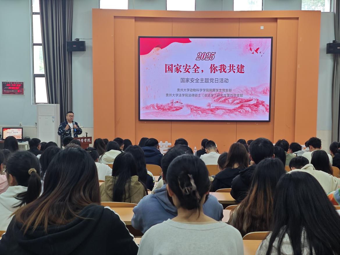 4月29日,为深入贯彻落实习近平总书记关于总体国家安全观的重要论述,增强师生国家安全意识,筑牢校园安全防线,贵州大学动物科学学院党委所属学生党支部与法学院法律硕士(非法学)研究生第四党支部在动物科学学院131报告厅联合举办“国家安全,你我共建”主题党日活动。活动通过专题学习、案例宣讲、知识竞答等形式,推动国家安全教育走深走实。