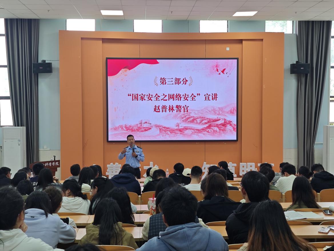 贵州大学松山派出所赵普林警官作“国家安全之网络安全”主题宣讲。赵普林通过案例分析的形式,向与会同志讲解了网络诈骗手法,包括兼职诈骗、刷单诈骗、冒充公检法诈骗、社交诈骗、裸聊敲诈、买卖演唱会门票诈骗等,揭露犯罪分子利用技术手段伪造身份、窃取资金的伎俩。他提醒同学们要遵循“四不”原则:不接听陌生电话、不相信陌生短信、不打开陌生链接、不向陌生账户转账。遇到可疑情况时,务必第一时间向周围老师、同学咨询,或向派出所求助。他警示同学们需将技术防御与意识教育相结合,共同维护网络安全。