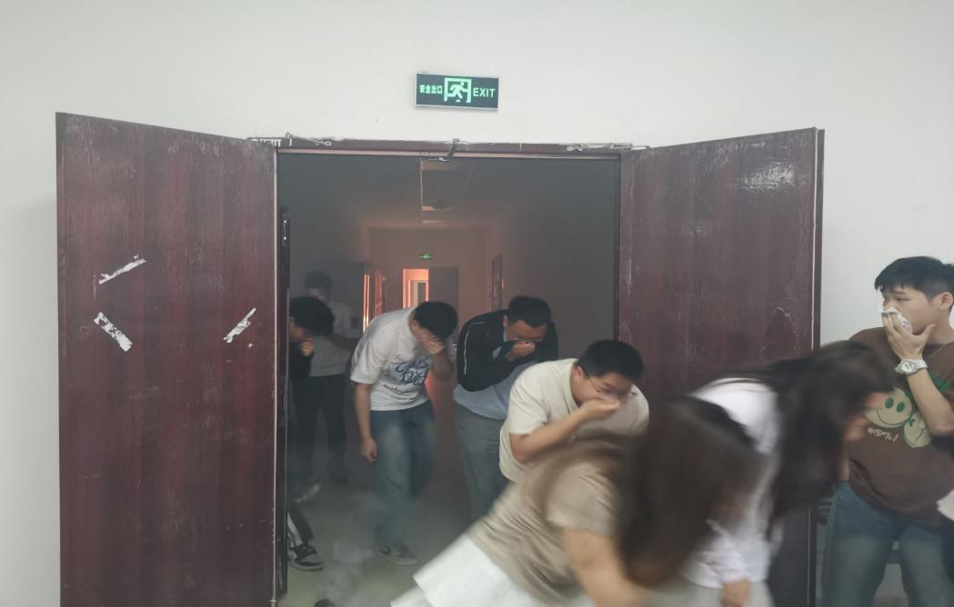 演练包含应急疏散演练及扑灭模拟火源两个模块。在模拟烟雾环境中,谷声兵组织师生进行应急疏散演练,指导大家实践弯腰低姿、湿布捂鼻、快速有序撤离的动作要领。在谷声兵的指导下,师生代表分组使用干粉灭火器对模拟火源(油盆火)进行扑灭操作,掌握 “提、拔、握、压” 四字诀窍。