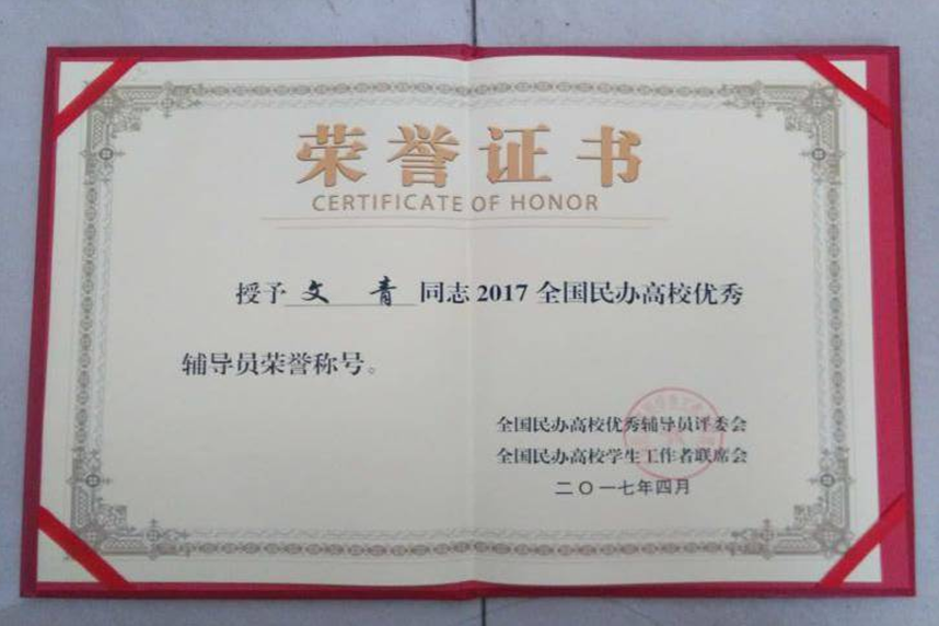 文青同志于2006年进入服装学院担任辅导员工作,现任服装工程学院党总支副书记。她在工作中注重观察学生的特点,发掘学生的潜质,及时肯定他们取得的每一点成绩。本着“把心放在学生身上,把学生放心上”的思想,她始终把学生摆在第一位,与学生相处的过程中做到亦师亦友,认真做好学生政治上的领路人、学习上的解惑人、生活中的贴心人、矛盾纠纷的调解人、教育教学秩序的维护人。文青同志在工作中得到领导和同事的认可,凭借良好的政治素养、扎实的理论功底及较强的业务能力荣获2017年全国民办高校“优秀辅导员”荣誉称号,可谓是实至名归。