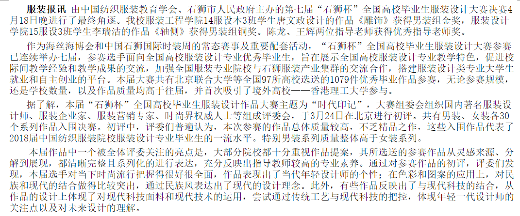 我校学生唐文政获全国高校毕业生服装设计大赛金奖