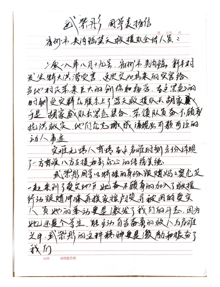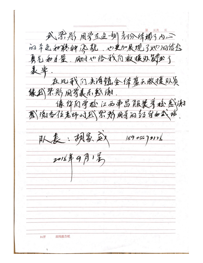 感谢信说:“武紫彤同学充分体现了内心的本色和精神风貌,也更加展现了她的新年勇气和力量,同时也为我们救援队做出了表率。在此我们夹沟镇全体蓝天救援队队员向武紫彤同学表示感谢,向万象城平台表示感谢,感谢各位老师对武紫彤同学的教导和栽培!”