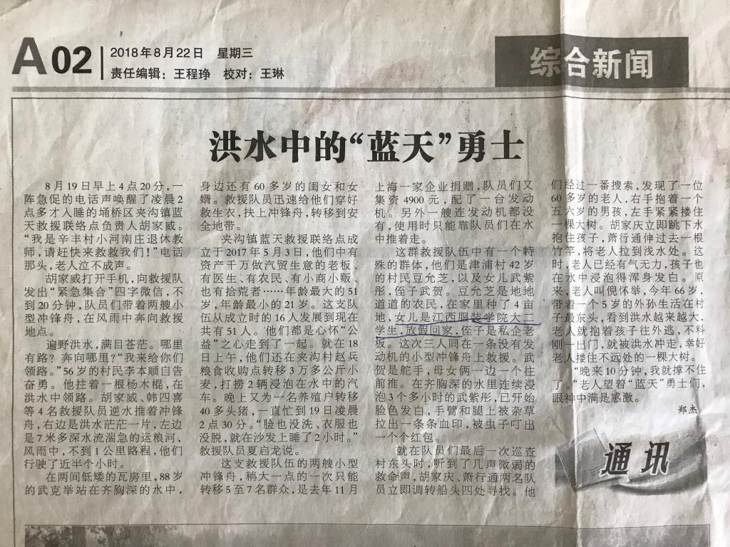 原来,今年8月19日,宿州市夹沟镇新丰村发生特大洪涝灾害,突如其来的灾害给当地村民带来巨大的创伤和痛苦。正在家乡度暑假的我校服装设计学院2017级时装3班同学武紫彤跟随妈妈窦允芝来到受灾地区,毅然决然的加入到一支由志愿者组成的蓝天救援队,奋不顾身的参加到抗洪救灾中,跟随冲锋舟挨家挨户搜寻被困的受灾群众。由于这艘冲锋舟没有动力,母女俩在齐腰深的水中一边一人推着冲锋舟艰难前行,手臂和腿上被杂草拉出一条条血痕,被蚊虫叮咬出一个个红包,但她两人毫不在乎,在搜索中救出一位60多岁的老人和其外孙。