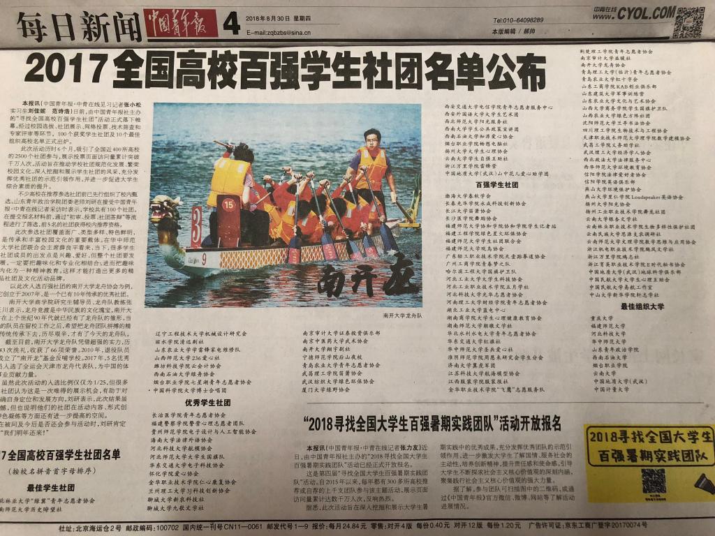 服装报讯 记者从中国青年报社获悉,2017“寻找全国高校百强学生社团”活动8月底正式落下帷幕。经过校园选拔、社团展示、网络投票、技术筛查和专家评审等环节, 100个获奖学生社团及10个最佳组织高校名单正式出炉。
