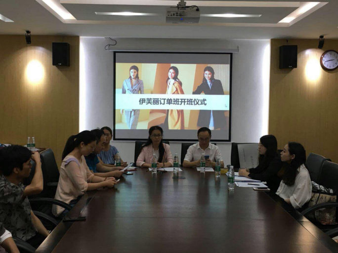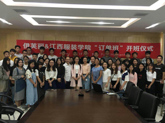 服装报讯 9月29日下午,我校与杭州意芙实业有限公司联合举办的“伊芙丽订单班”开班典礼在服装工程学院会议室举行。服装工程学院院长陈娟芬、党总支副书记蓝岚,杭州意芙实业有限公司人事总监田盛林、人事部经理李敏以及工程学院部分老师和订单班所有学生参加了开班仪式。