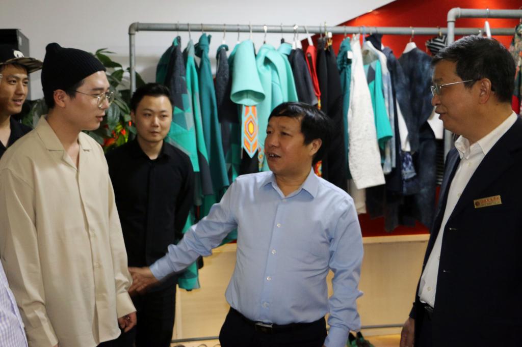 在798创意设计中心,孙副省长一行重点考察了CHEN·1988工作室,婵韵匠坊、张肇达大师工作室。在CHEN·1988工作室,孙副省长与我校青年教师陈龙、付志臣亲切交流,对陈龙老师在天然皮草青年设计大赛ASIA REMIX 2018获得大赛最高奖项Grand Prize大奖以及在国内上各项赛事摘金夺银表示赞赏和鼓励。参观中,孙副省长不时停下来观看学生实践操作,聆听老师讲课,并和一些学生就实践环节的学习情况进行了交谈,他鼓励学生们珍惜时间,认真学习,学出真本领,为社会作贡献。