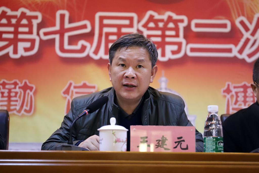 王建元书记首先致辞。他代表学校理事会、党委和校委会对大会的召开表示热烈的祝贺!向为学校发展做出积极贡献的全体代表、教职员工表示衷心的感谢和崇高的敬意!他说,一年来,学校各单位、各部门以本科教学合格评估为抓手,注重提高教育教学质量,着力优化育人环境,在思想政治教育、教学科研、师德师风、学生管理、基础建设、校园文化建设、平安校园创建等方面,取得了显著的成绩。