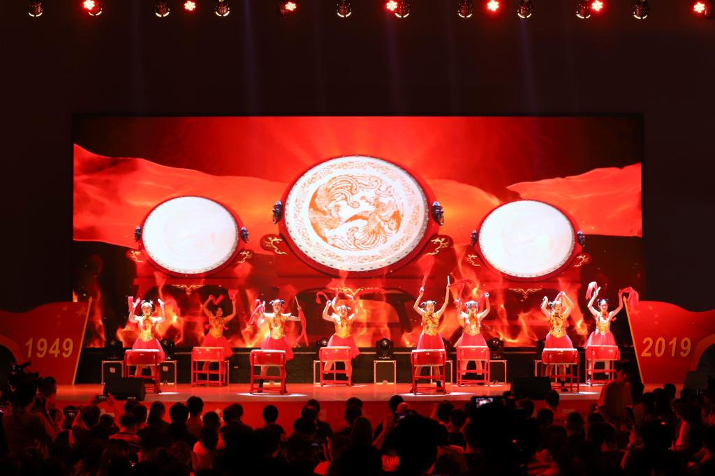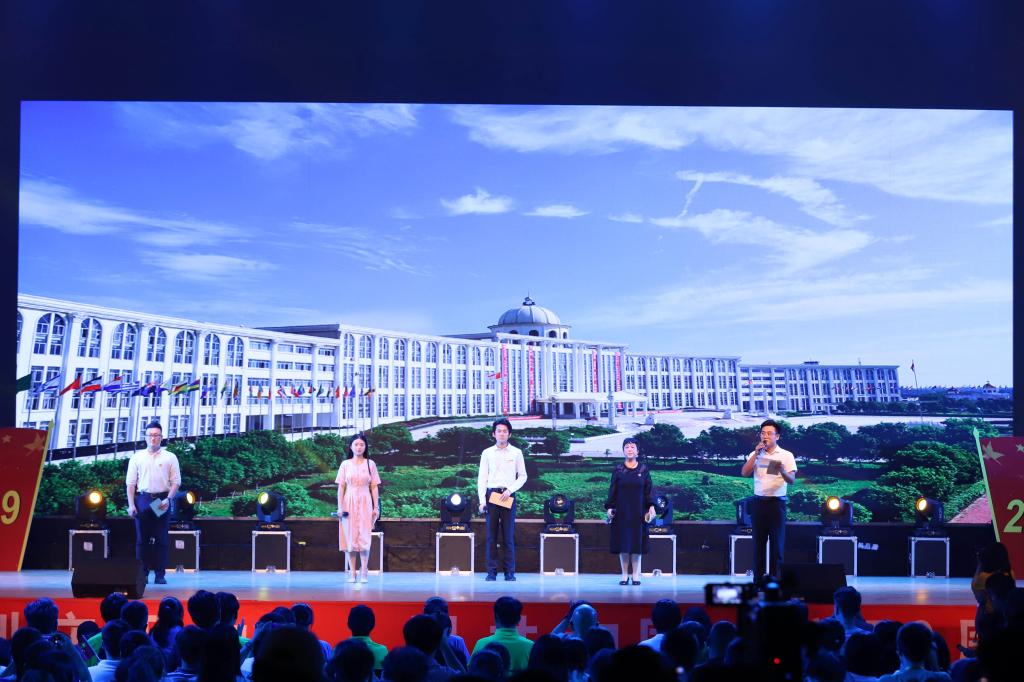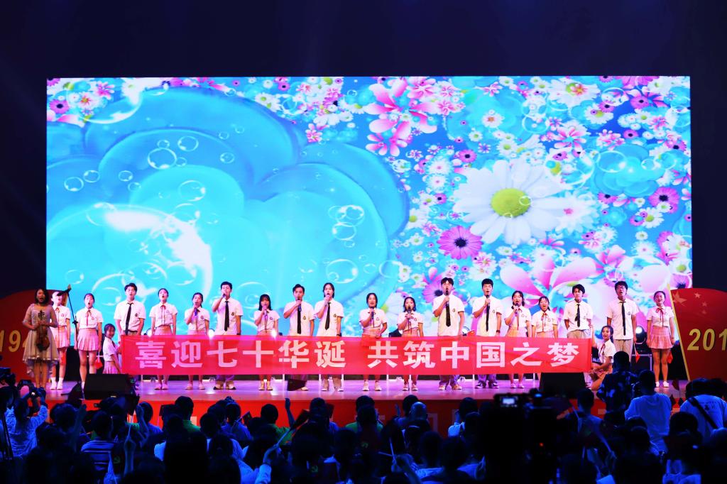 校国旗护卫队员护卫着鲜艳的五星红旗登上舞台中央,全场师生起立同声高唱《中华人民共和国国歌》,将晚会帷幕拉开。LED大银幕上,气势磅礴的《锦绣河山》,震人心魄的《大河奔流》,美丽如画的《牡丹盛放》,以及全场师生的欢呼雀跃,掀起了国庆联欢晚会的第一轮高潮。