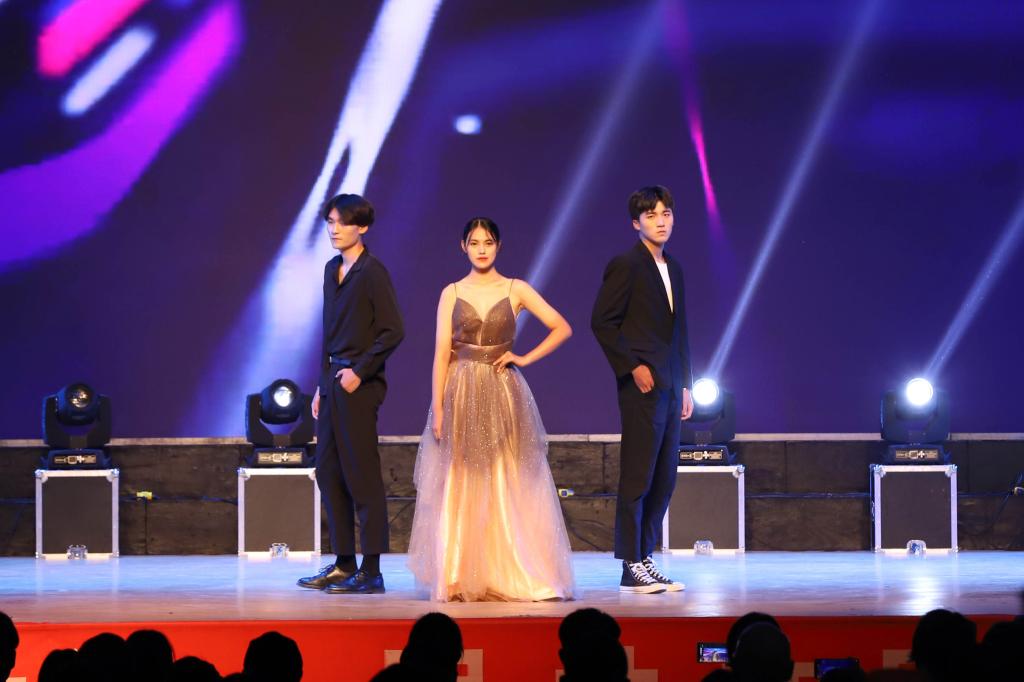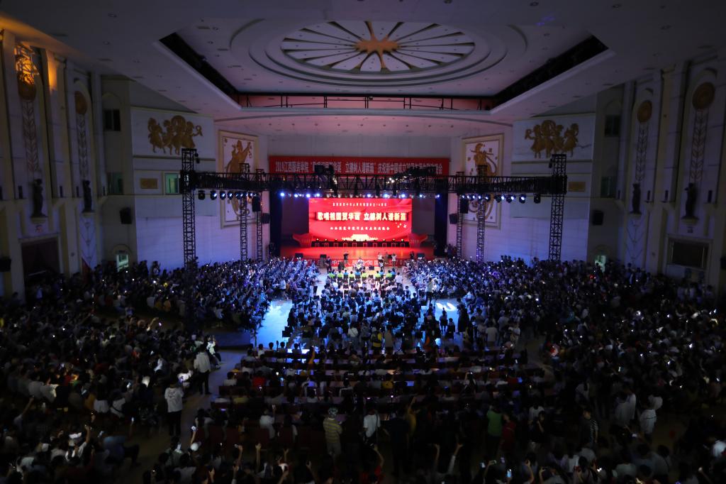 第二篇章《奋斗》,不管是小合唱《我们都是追梦人》所引起的感动激情,还是青春风采秀《青春跃起来》、时装秀《梦寐·江服》所展现的时尚与青春,不论是朗诵《以青春的名义》所带来的振奋与激昂,还是青春歌曲联唱《流金岁月》所激发的自豪与荣耀,都让我们深切感受到伟大的中国共产党,与广大群众同呼吸、共命运、心连心,为中国人民谋幸福、为中华民族谋复兴的初心使命。同学们尽情挥动手中的党旗、国旗,打开手机的闪光灯,和着音乐引吭高歌,台上台下情景交融,振奋人心。