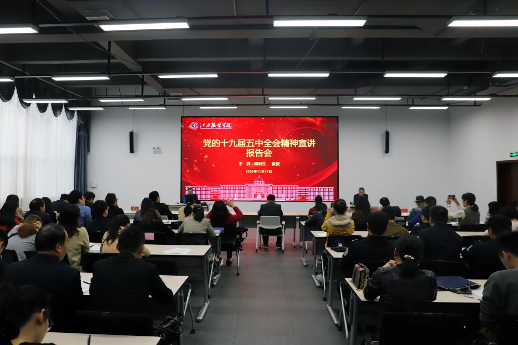 受聘仪式后,周利生教授为在座师生宣讲党的十九届五中全会精神。周利生从全会的新发展阶段、新发展理念、新发展格局等重大问题进行了深入的解读。从认清和把握进入新发展阶段的重大意义、形势变化、重要特征、机遇挑战、有利条件、目标任务和战略构想等方面,全面系统地阐释了党的十九届五中全会精神。他指出,党的十九届五中全会,是在我们党全面建成小康社会胜利在望、全面建设社会主义现代化国家新征程即将开启的重要历史时刻,召开的一次十分重要的会议。全会通过的“十四五”规划《建议》是开启全面建设社会主义现代化国家新征程、向第二个百年奋斗目标进军的纲领性文件。习近平总书记在全会上的重要讲话,进一步升华了我们党对经济社会发展规律、社会主义建设规律的认识,为推动高质量发展、构建新发展格局,夺取全面建设社会主义现代化国家新胜利提供了科学指南和根本遵循。