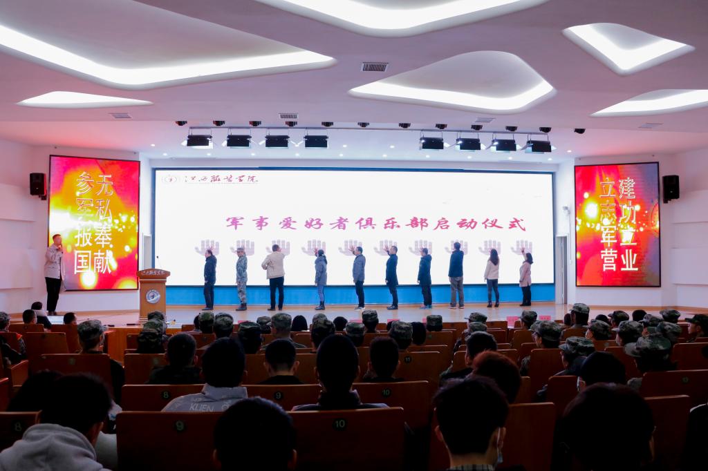 为普及国防教育、增强国防意识、鼓励献身国防、充实校园文化生活和推动我校的精神文明建设。欢送会现场举行了“万象城平台军事爱好者俱乐部”成立仪式,武装部副部长鲍鹏作军事爱好者俱乐部成立报告。他介绍说,俱乐部将充分利用南昌地区丰富的国防教育资源,江西的红色文化资源,开展丰富多彩、形式多样、同学们乐于参与的军事文化和拓展活动,让加入这个组织的同学们学得愉快、学得实在、学有所获。