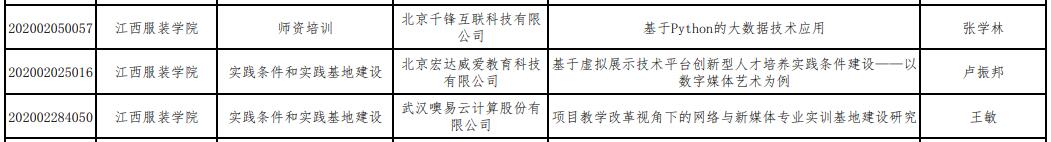 新闻中心讯(万强)近日,教育部下发《教育部高等教育司关于公布2020年产学合作协同育人项目立项名单的通知》(教高司函〔2021〕3号),公布了2020年第一批产学合作协同育人立项项目名单,我校“基于Python的大数据技术应用”“基于虚拟展示技术平台创新型人才培养实践条件建设——以数字媒体艺术为例”“项目教学改革视角下的网络与新媒体专业实训基地建设研究”3个项目成功获批立项。