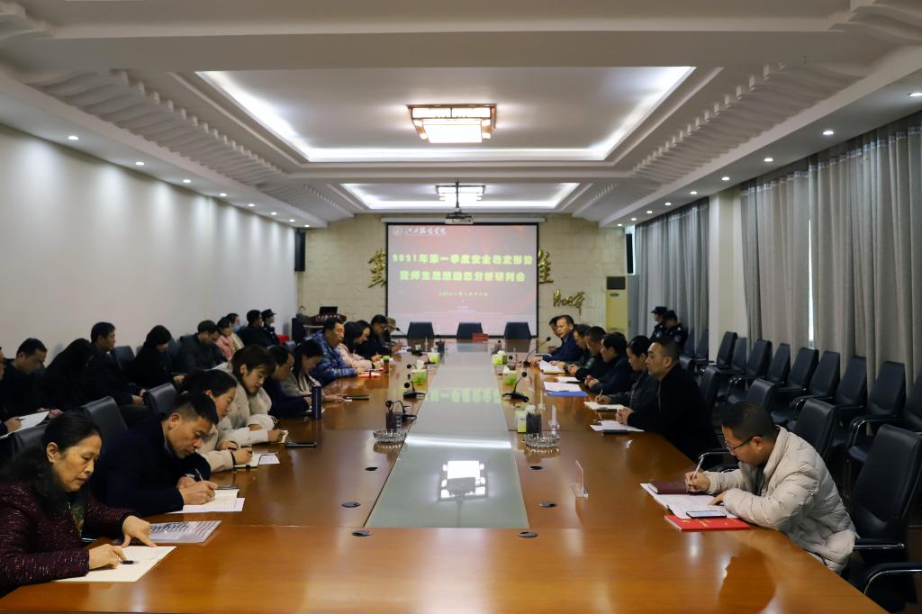 新闻中心讯(文/胡思琪 图/万强)3⽉12⽇上午,我校在⾏政楼⼆楼会议室召开2021年春季开学初安全稳定形势暨师生思想动态分析研判会。理事⻓涂顺强、校⻓薛家宝、党委书记陈付⻰、副理事⻓涂燕萍等校领导出席会议,各二级学院党政负责⼈、各部⻔主要负责⼈参加会议。党委副书记唐新强主持会议。