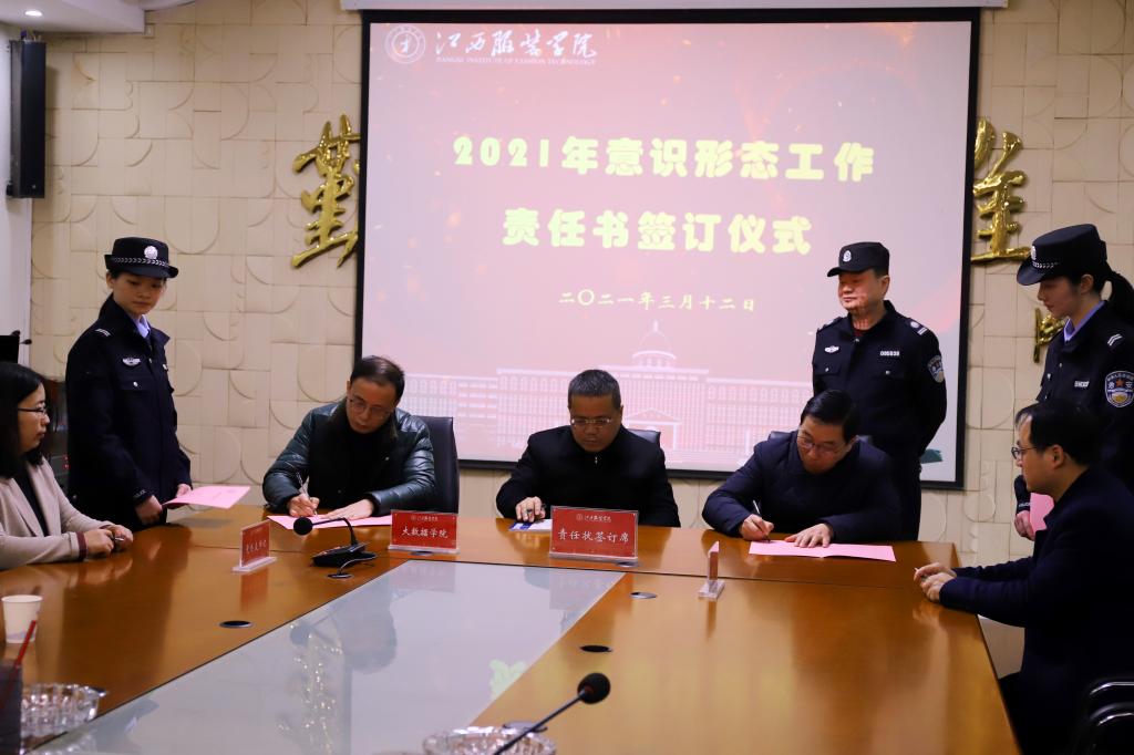 研判会结束后,举行了平安建设工作、意识形态工作责任书签订仪式。学校理事⻓涂顺强、校⻓薛家宝、党委书记陈付⻰与各⼆级学院负责人签订了责任书。