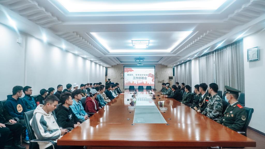 新闻中心讯:3月17日,我校在行政楼二楼会议室召开教官大队、军事爱好者俱乐部工作部署会。校党委副书记唐新强、武装部副部长鲍鹏、武装部胡康老师、教官大队和在校退伍学生代表共50余人参加了会议。
