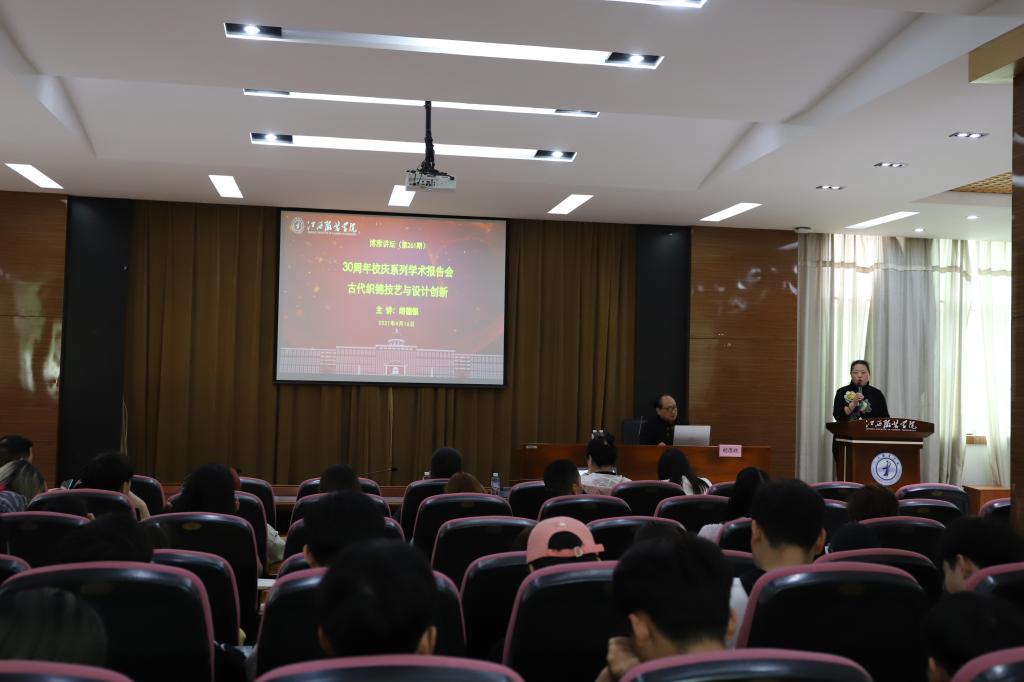 新闻中心讯(段婷) 4月16日下午,南京云锦织造的代表性传承人胡德银应邀来校,作题为“古代织锦技艺与设计创新”专题讲座,本次讲座是我校30周年校庆系列学术活动之一。讲座在行政楼一楼报告厅举行,学校理事长涂顺强、服装设计学院、服装工程学院、人文学院的师生聆听了讲座。讲座由教授评议会秘书长段婷主持。