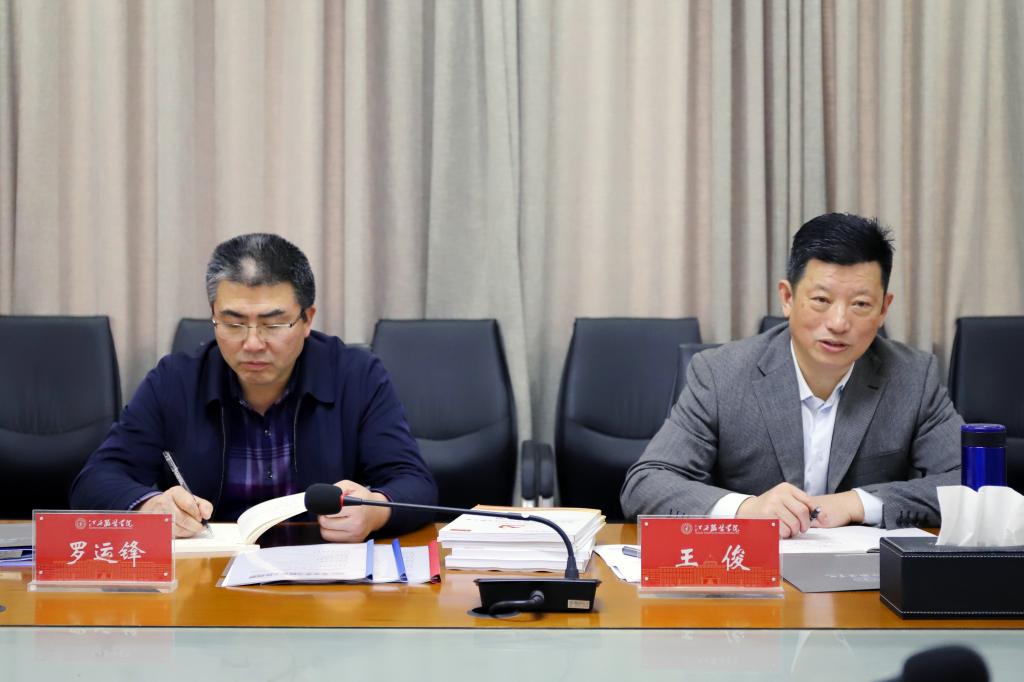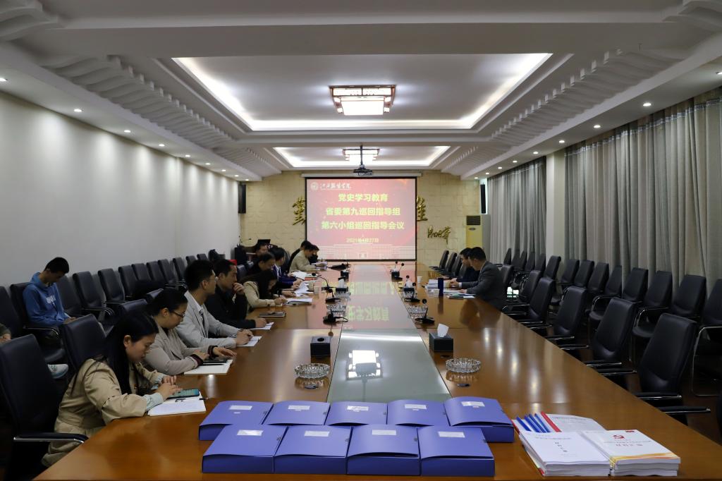 新闻中心讯(文/李金燕 万强 图/万强)4月27日下午,省委党史学习教育第九巡回指导组第六小组组长、省教育厅原副巡视员王俊,联络员、省教育厅评估研究院高教所副所长罗运锋一行来校调研指导党史学习教育开展情况。我校党史学习教育领导小组组长、党委书记陈付龙,副组长、党委副书记唐新强及领导小组成员参加了会议。